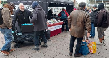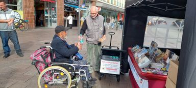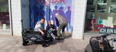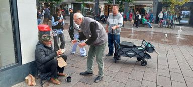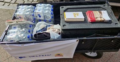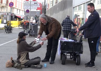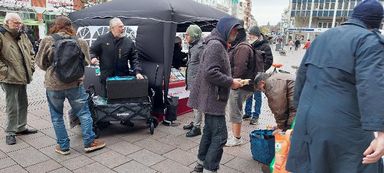 Lebensmittel & Wasser aus dem Bollerwagen für wohnungs-, obdachlose und sonstigen armen Menschen