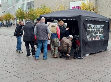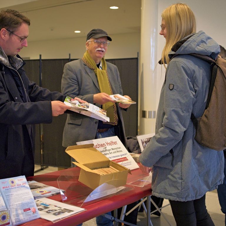 Im Foto: Eine Besucherin in Unterhaltung mit dem Vorsitzenden der Fides Humanitas Stiftung, Wolfgang Freywald (rechts), und dem Helfer Jan Brockhaus.
